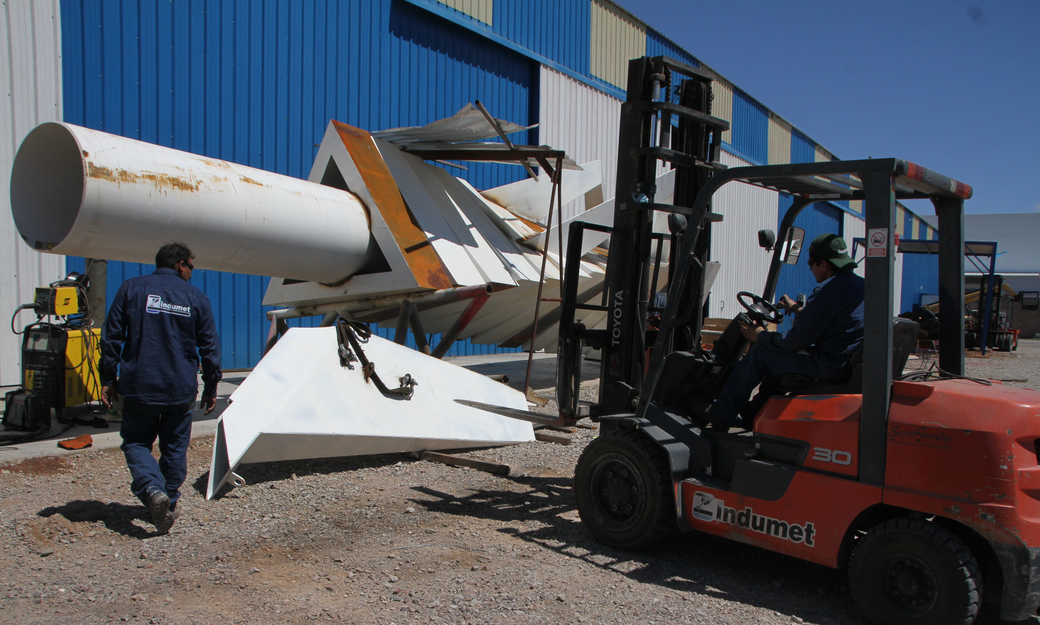 Faraónica. Los obreros de la metalúrgica trabajan en la parte inferior del cristo. Deben utilizar grúas y otro tipo de maquinaria pesada para poder manipular la inmensa obra de arte.