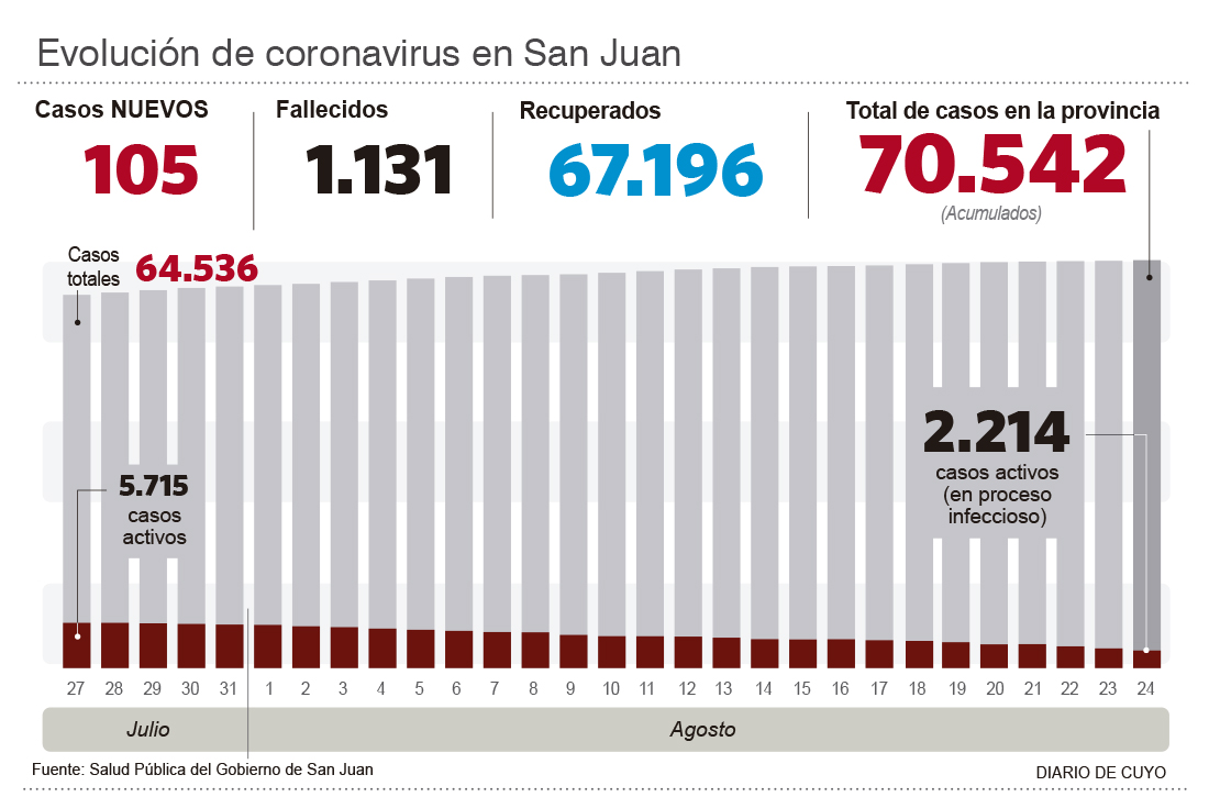 De acuerdo al Ministerio de Salud Pública, la provincia reportó ayer tres nuevas muertes: se trata de tres mujeres de 71; 61 y 65 años. De esta manera, el total de fallecidos en la provincia es de 1.131.