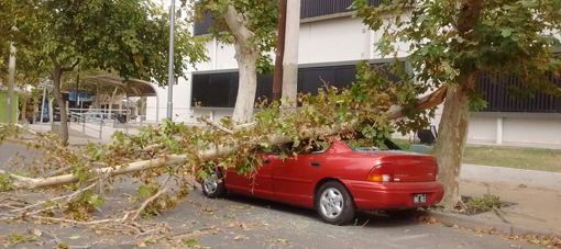 Entre los episodios que registramos con imágenes en este nota, se destacan dos: por calle Mendoza, pasando 25 de Mayo, dos ramas de un eucalipto se precipitaron sobre un auto, dejándolo con abollones en el techo y el capot. En tanto que en calle Oro y Rojas, en Chimbas, un árbol se desplomó en la calle. Según los vecinos, el ejemplar estaba seco.