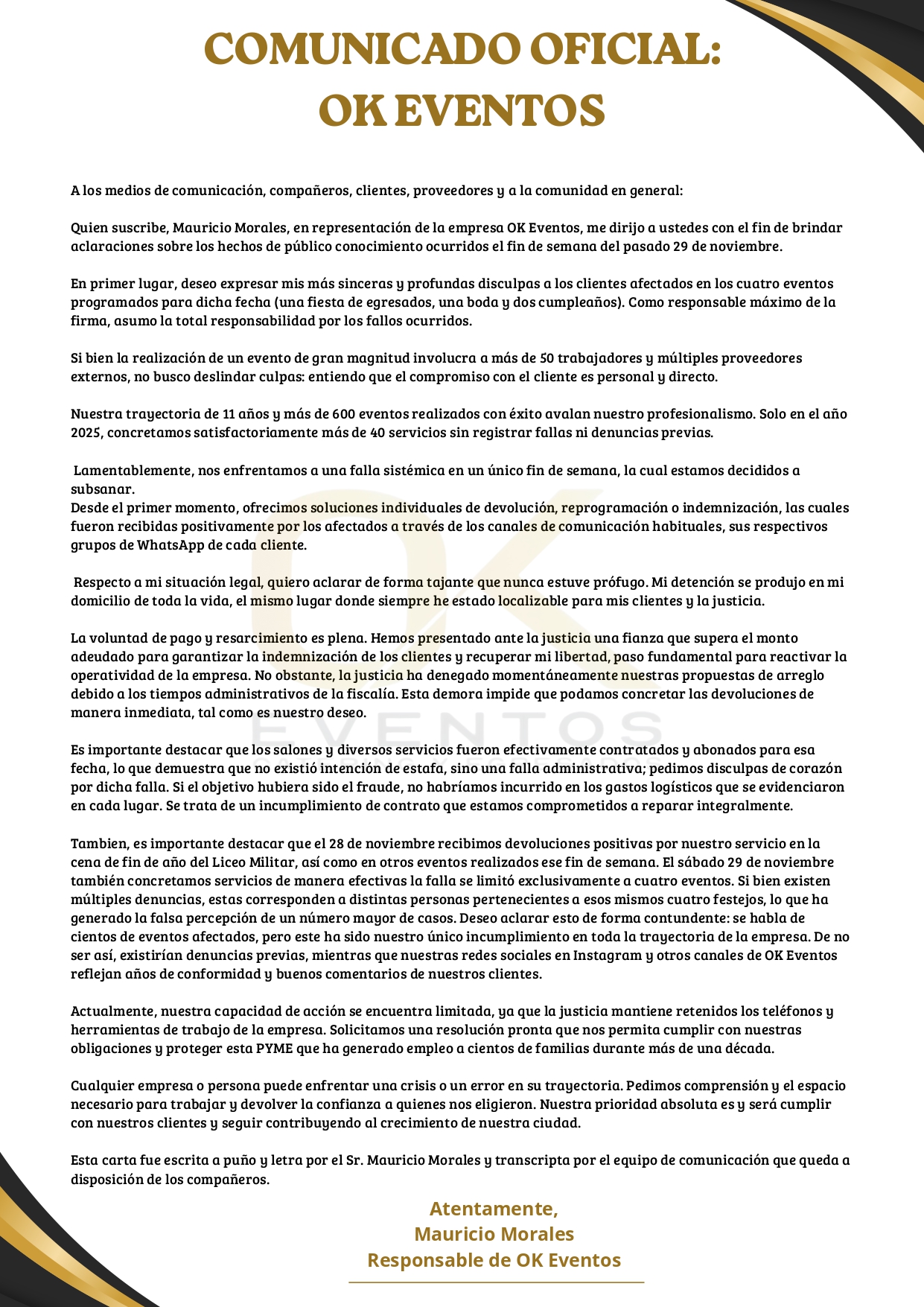 “Deseo aclarar esto de forma contundente: se habla de cientos de eventos afectados, pero este ha sido nuestro único incumplimiento en toda la trayectoria de la empresa. De no ser así, existirían denuncias previas, mientras que nuestras redes sociales en Instagram y otros canales de OK Eventos reflejan años de conformidad y buenos comentarios de nuestros clientes”, insiste.