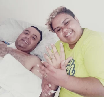 Esa situación de ver a su novio en grave estado motivó a la chica a llevar a cabo la propuesta. “Estaba acá mal y se me ocurrió esa idea, la llamé a mi mamá para contarle y me dio todo su apoyo porque lo quieren mucho a Anibal, ahí no más fui y con unos ahorros que tenía porque queríamos irnos a vivir juntos, compré las alianzas”, comenta todavía emocionada la chica. Aprovechando que su novio ya presentaba una notable mejoría y que justamente este viernes lo pasaron a una sala común, Celeste llevó a cabo su plan para sorprender a su novio. “Se emocionó, se puso a llorar porque nunca se imaginó que iba hacer eso, obviamente que me dijo que sí”, expresó la futura esposa.