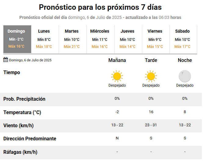 Según lo que indica el Servicio Meteorológico Nacional, para este domingo 6 de julio, se espera en San Juan que la máxima ascienda hasta los 16°C, mientras que la mínima será de -2ºC.