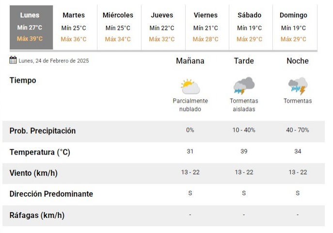 Según lo que indica el Servicio Meteorológico Nacional, para este lunes 24 se espera que la máxima ascienda hasta los 39°C mientras que la mínima será de 25°C.