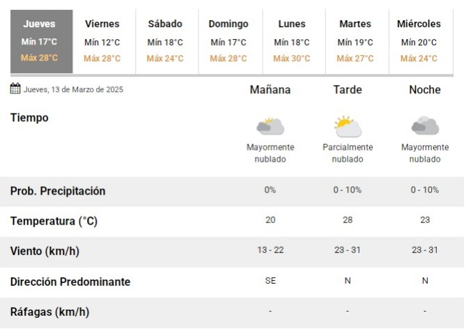 Según lo que indica el Servicio Meteorológico Nacional, para este jueves 13 de marzo se espera que la máxima ascienda hasta los 28°C mientras que la mínima será de 17°C.