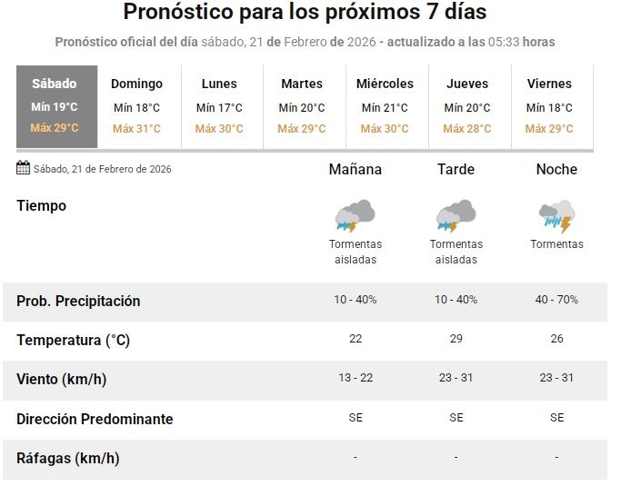 Este sábado 21 de febrero estará marcado por condiciones inestables en San Juan. El Servicio Meteorológico Nacional anticipa lluvias por la mañana y la tarde, con tormentas que abarcarían a toda la provincia en la noche.