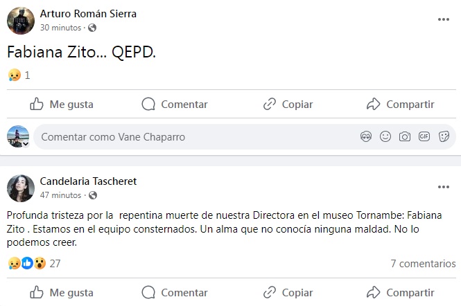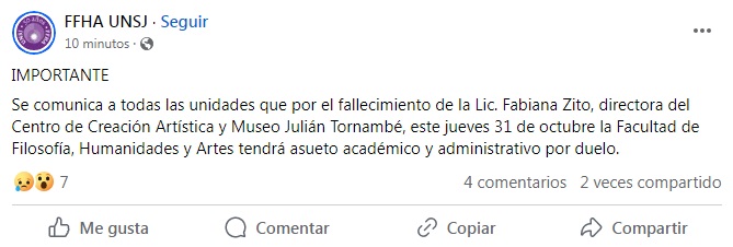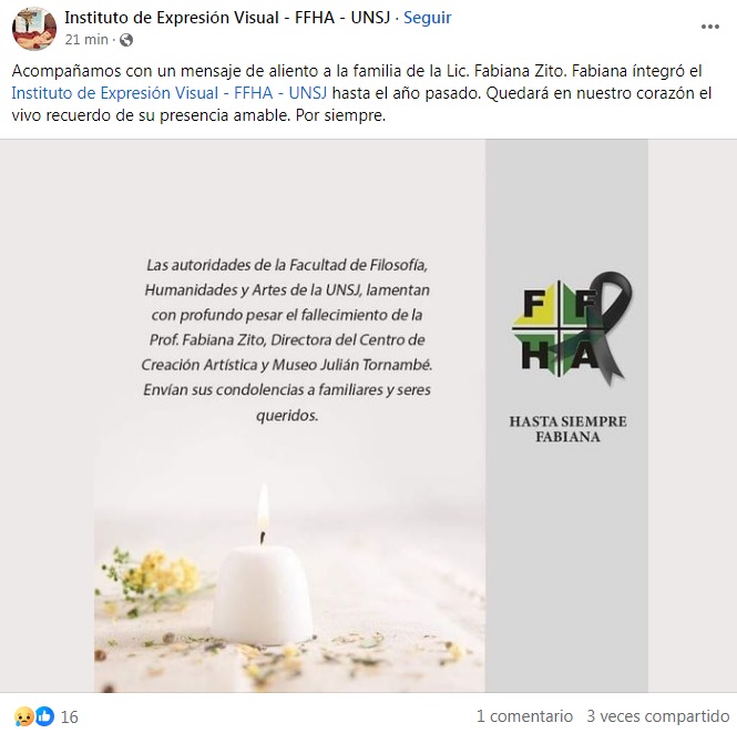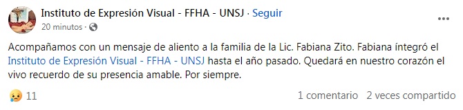 “Acompañamos con un mensaje de aliento a la familia de la Lic. Fabiana Zito. Fabiana integró el Instituto de Expresión Visual-FFHA-UNSJ hasta el año pasado. Quedará en nuestro corazón el vivo recuerdo de su presencia amable. Por siempre”, escribieron en el Instituto de Expresión Visual – FFHA – UNSJ.