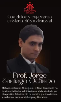 Causó conmoción en Don Bosco el repentino fallecimiento del joven profesor Jorge Santiago Ocampo. La comunidad Saleciana los despidió con mucho cariño al docente, profesor de Lengua y Literatura del Nivel Secundario; además era egresado de la institución.