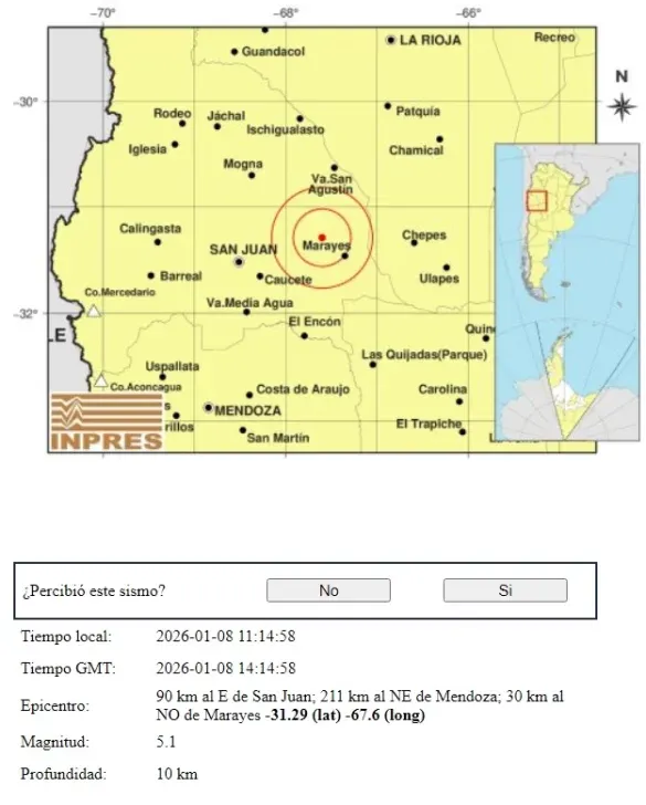 Un sismo de magnitud 5.1 en la escala de Richter se registró este jueves con epicentro en Marayes, Caucete. El movimiento se registró a las 11.14 horas de la mañana de este jueves, según lo informado por el Instituto Nacional de Prevención Sísmica (INPRES).