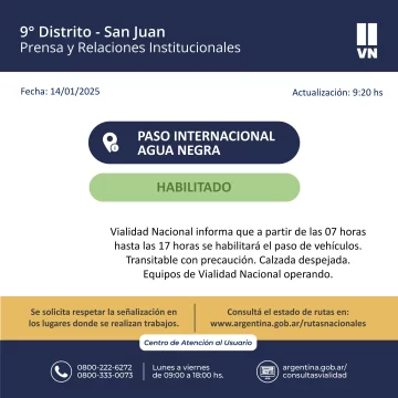 Vialidad Nacional informó que este martes 14, pasadas las 9.00 fue reabierto el Paso de Agua Negra.