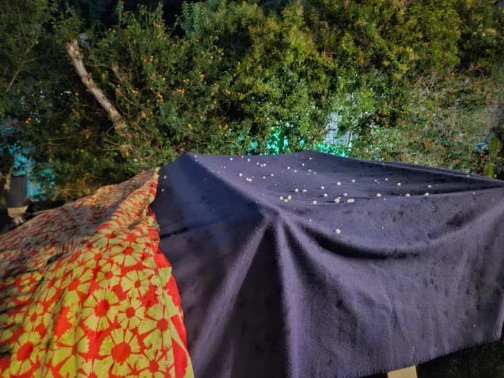 Por el momento, se desconocen daños en casas y vehículos aunque se percibió un importante cantidad de hojas y ramas en el suelo producto del impacto de la piedra.