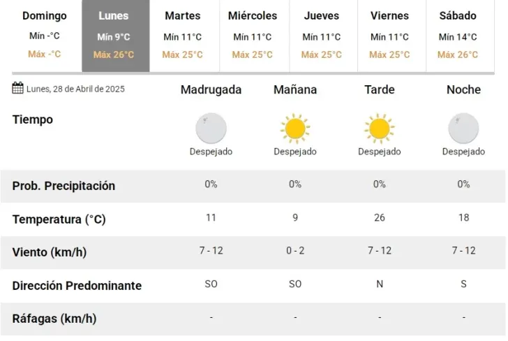 Este lunes 28 de abril se viene con tiempo agradable en San Juan. Según el Servicio Meteorológico Nacional (SMN), la jornada se presentará despejada, con sol y 26°C de máxima.