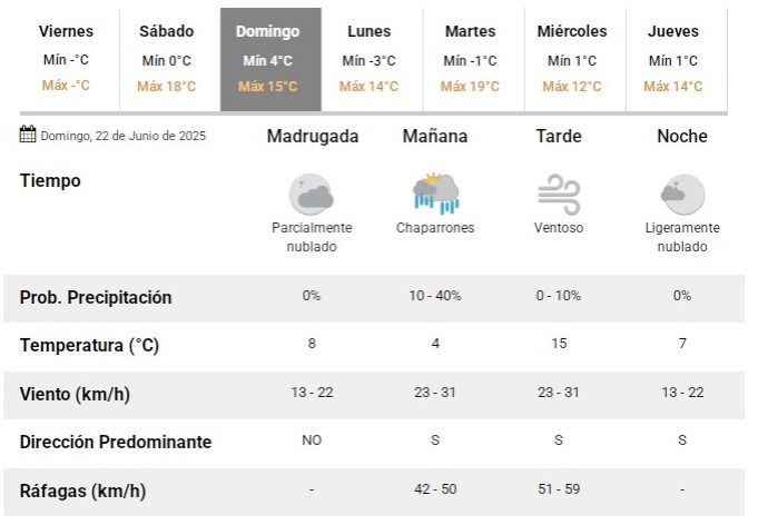 Para el domingo, prevén que la máxima trepará hasta los 15°C mientras que la mínima caerá hasta los 4°C. La jornada se presentará con cielo parcial a ligeramente nublado y anticipan que habrá chaparrones.
