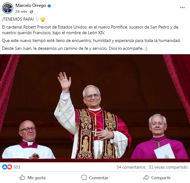 “Tenemos Papa”, abrió su publicación y luego agregó: “Robert Prevost de Estados Unidos es el nuevo pontífice, sucesor de San Pedro y de nuestro querido Francisco, bajo el nombre de León XIV. Que este nuevo tiempo esté lleno de encuentro, humildad y esperanza para toda la humanidad. Desde San Juan, le deseamos un camino de fe y servicio. Dios lo acompañe”, expresó Orrego.