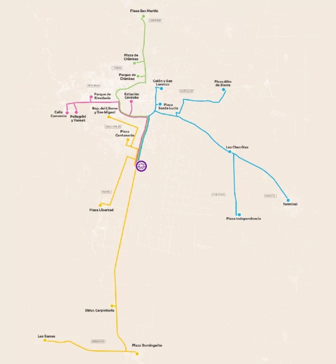 - Línea Magenta conectará el Oeste con el Estadio. Los colectivos saldrán desde cuatro lugares: uno de ellos será el Parque de Rivadavia; otras dos salidas se ubicarán en La Bebida; mientras que en Capital saldrán micros desde la Estación Córdoba.