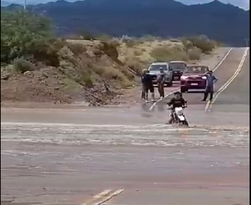 Tras la tormenta de este sábado, el agua bajó por los cauces normalmente secos, atravesando los badenes de varias rutas. En Ullum, un motociclista intentó cruzar hasta que la corriente se lo impidió y tuvo que dejar ir el vehículo.
