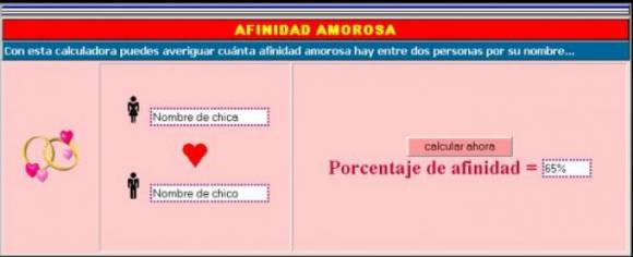 Puede parecer extraño, pero la estadística es capaz de establecer relaciones entre los nombres de las personas y sus posibilidades de éxito, y Afinidad Amorosa no es más que una sencilla calculadora basada en algoritmos matemáticos, que establece dicho porcentaje de afinidad.