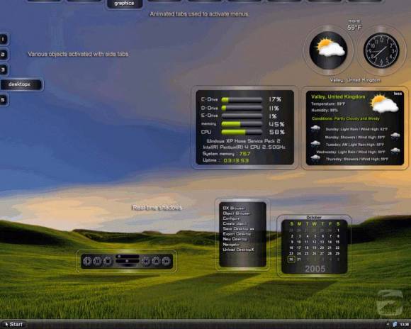 DesktopX puede transformar la interface de la PC a través de la inserción de nuevos elementos animados que hacen las veces de Gadgets que trabajan como accesos directos a otros programas.