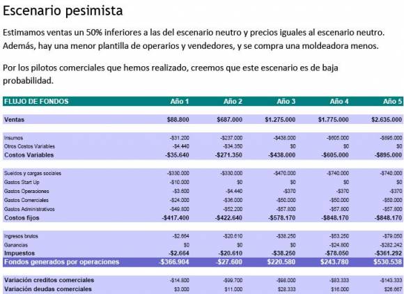 En cuanto al plan financiero, se aprovecha una herramienta similar a la planilla de cálculo de Microsoft Excel. Las celdas con valores en color azul son las que el usuario debe completar con valores. Aquellas que tienen valores en negro son modificadas automáticamente por el programa.