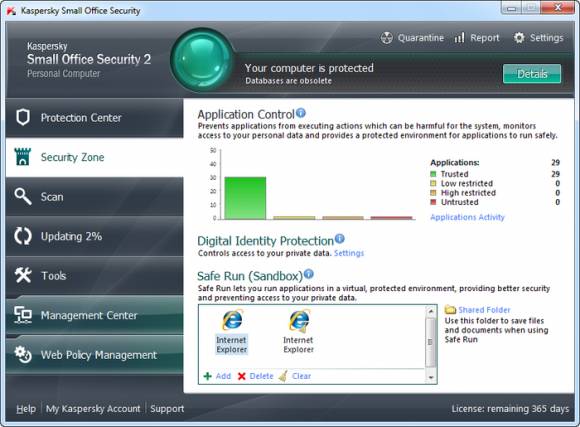 Kaspersky Small Office Security es software con mucho desarrollo y buen desempeño. Se instala rápidamente y la primera actualización de la base de datos es también bastante ágil. Es muy fácil de configurar para los usuarios de todos los niveles. De hecho, la configuración por defecto cubre la mayoría de las necesidades de los usuarios Pyme, por lo que hace que la tarea de parametrización inicial sea sumamente simple.