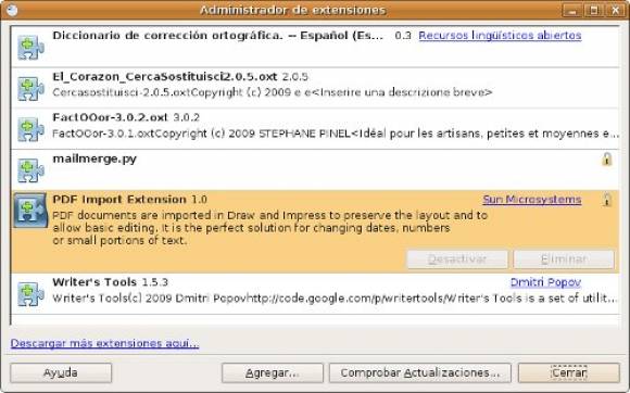 Tal es el caso de Sun PDF Import, que permite importar y modificar documentos en formato PDF, o la extensión que ayuda a subir documentos a Google Docs directamente desde OpenOffice.