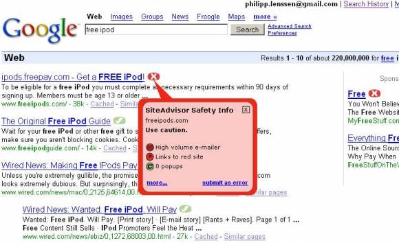 Los usuarios también pueden navegar de manera segura en la Web al utilizar el cuadro Búsqueda segura, que se ubica dentro del explorador Web cuando se instala SiteAdvisor, el cual automáticamente bloquea los sitios “rojos” dentro de los resultados de búsqueda de un usuario que tienen descargas potencialmente peligrosas, incluido virus, spyware y otros software dañinos.