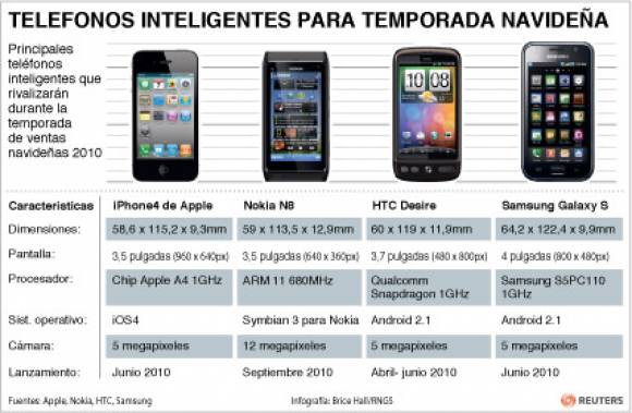 Día a día es más difícil sorprenderse con las prestaciones que incluyen este tipo de teléfonos, que desde su media gama a gama alta, ya son capaces de reconocer el nombre de un tema musical que se está escuchando en el ambiente, trabajar en Internet casi sin ningún tipo de limitaciones, desarrollar programas, trabajos de oficina y todo tipo de compras y ventas. Cuatro teléfonos resuenan fuerte para el fin de año 2010.