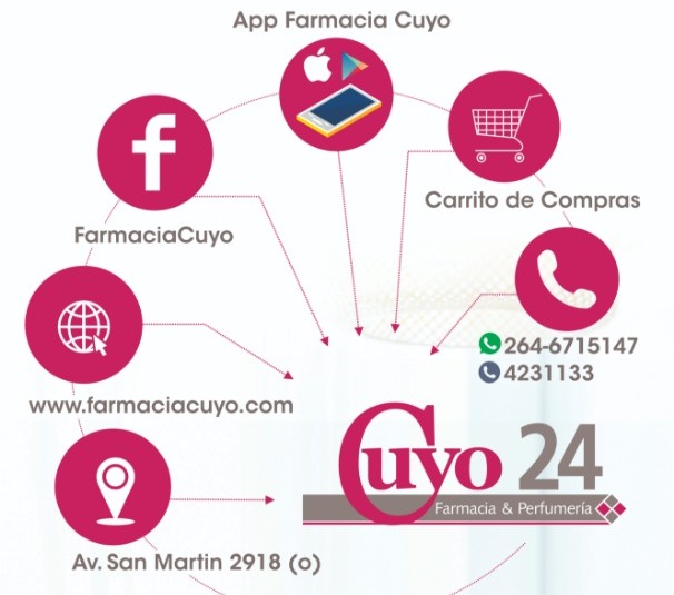 Ahora no es necesario ir a la farmacia para adquirir tus productos podes hacerlo descargando la App en tu celular (desde Google Play para Android o AppStore para Iphone) desde la que podes hacer consultas, enviar una imagen de tu receta o del producto que quieres adquirir y recibirlo en tu casa para pagarlo de contado, con tu tarjeta y con el descuento de tu obra social. También podes hacerlo por whatspp contactando al 264-6715147 o a través de la pagina web www.farmaciacuyo.com adonde encontraras los productos, con sus imágenes y la posibilidad de abonarlos con Mercado Pago o Todo Pago con cualquier tarjeta.