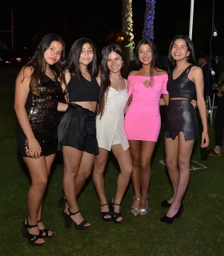 En compañía de sus hermanos, Sebastián de la Torre Martinazzo y Bautista de la Torre Martinazzo, la quinceañera María Paz de la Torre Martinazzo ingresó al salón de Quinta La Berta, donde la esperaban sus amigos, familiares y su madre, Gimena Martinazzo.