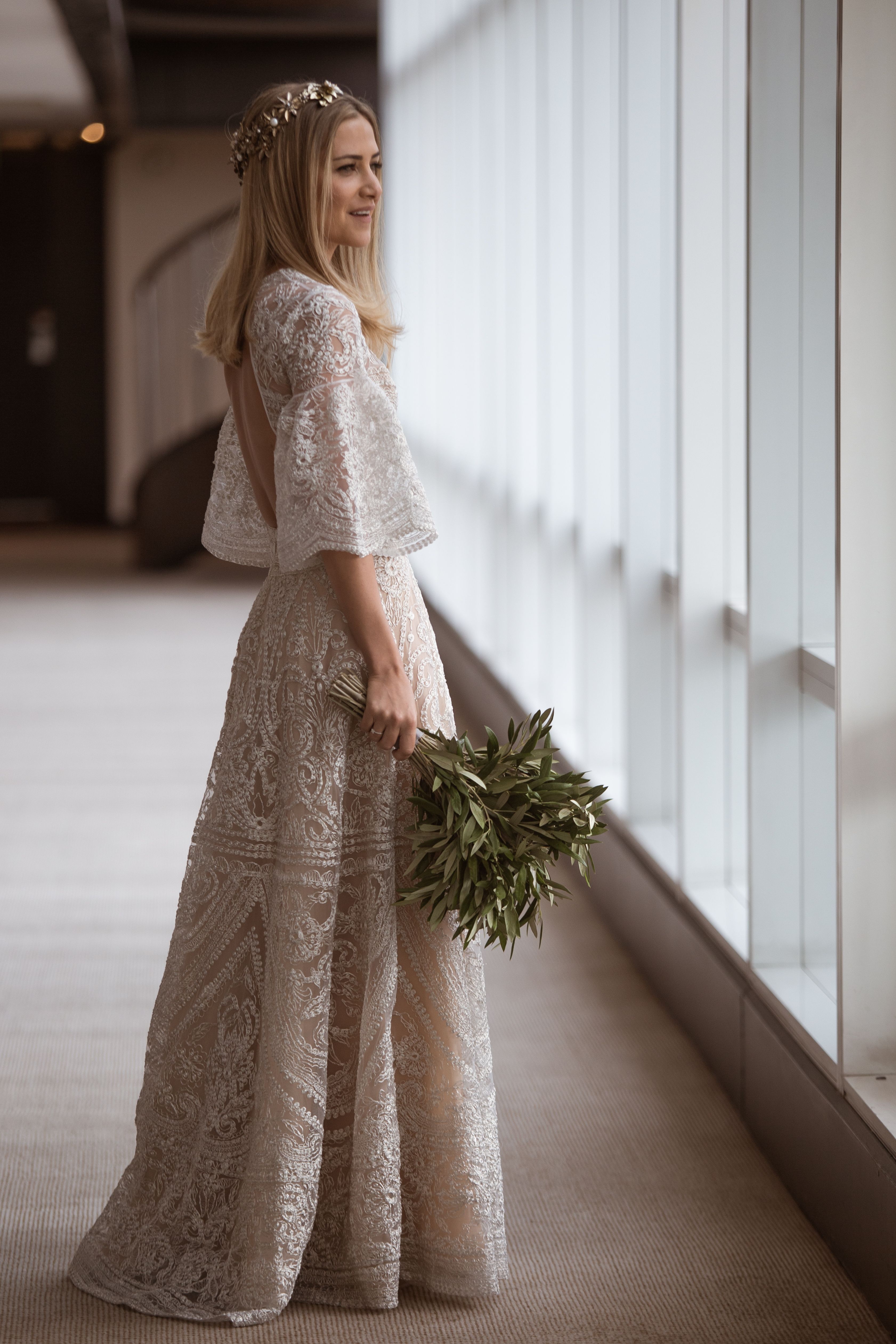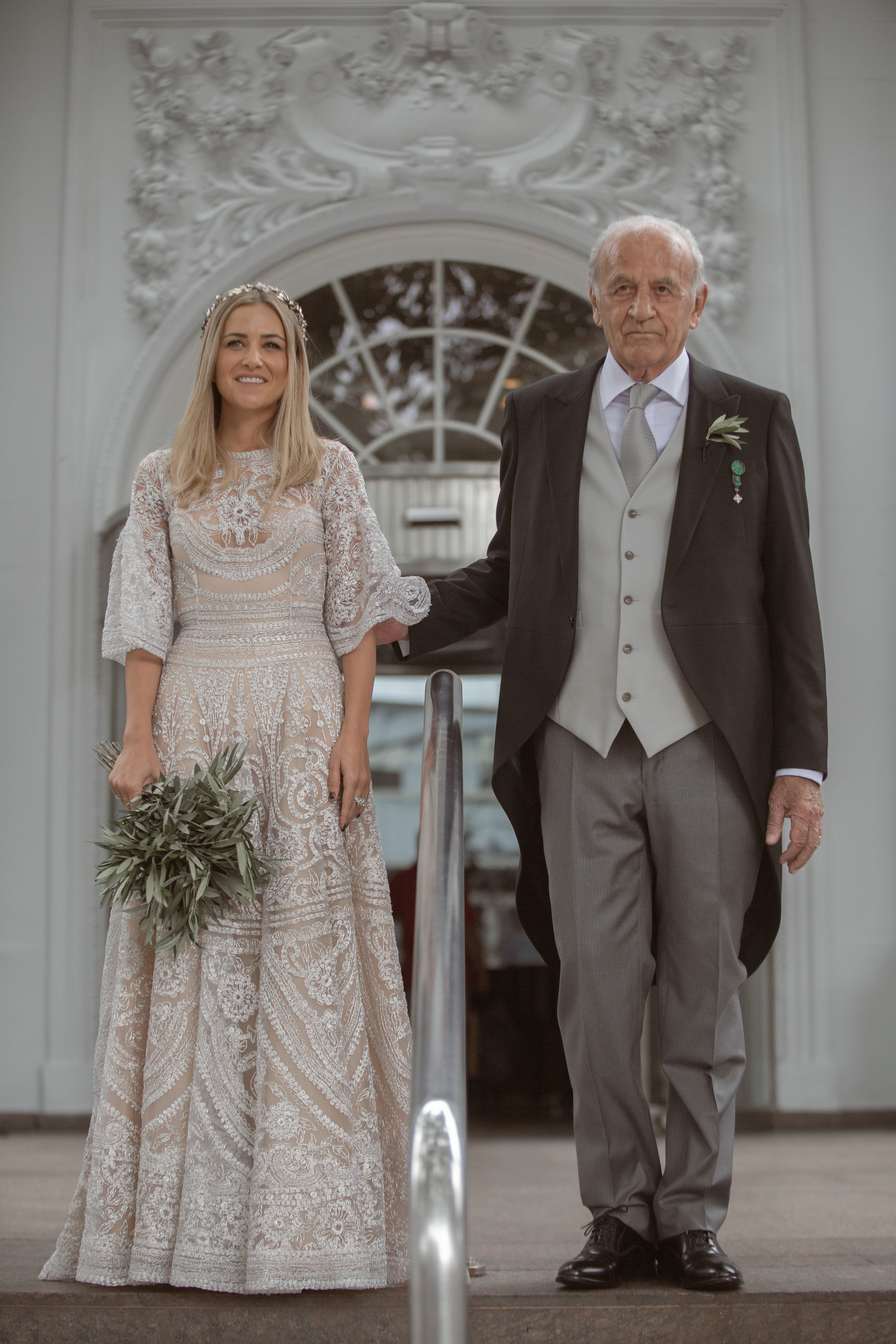 Milagros lució un vestido de Naeem Khan, diseñador americano-hindú, bordado a mano en India en hilos de plata. Hizo su entrada a la iglesia del brazo de Adriano Senetiner.