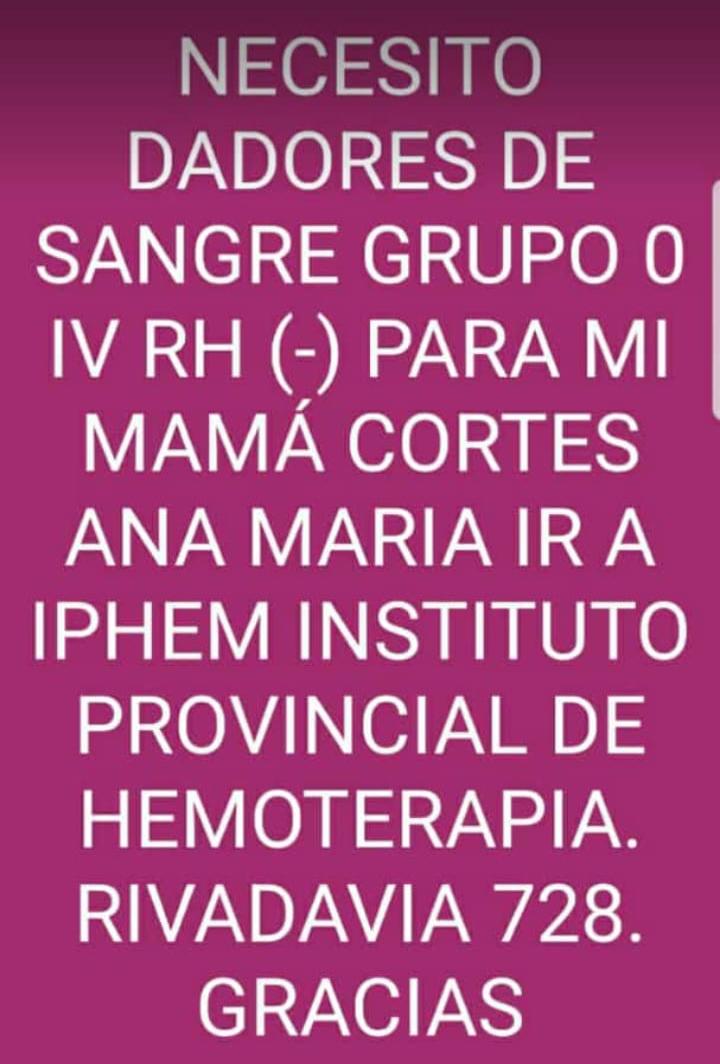 La familia de Ana María Cortés realizó un pedido para todos los que puedan donar sangre del grupo O IV RH (-).