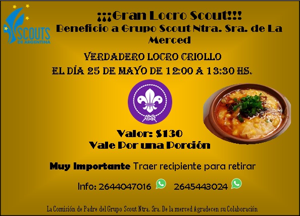 Con muchos planes por delante, la Comisión de Padres del Grupo Scout Nuestra Señora De La Merced se encuentra recaudando fondos para los chicos que el próximo mes de julio se van de campamento de invierno. Para eso pusieron a la venta "verdadero locro criollo", con un valor de $130 por porción. Puede encargarse por Whatsapp al 2644047016 o al 2645443024, y se retira mañana de 12 a 13.30 por la puerta de la iglesia.