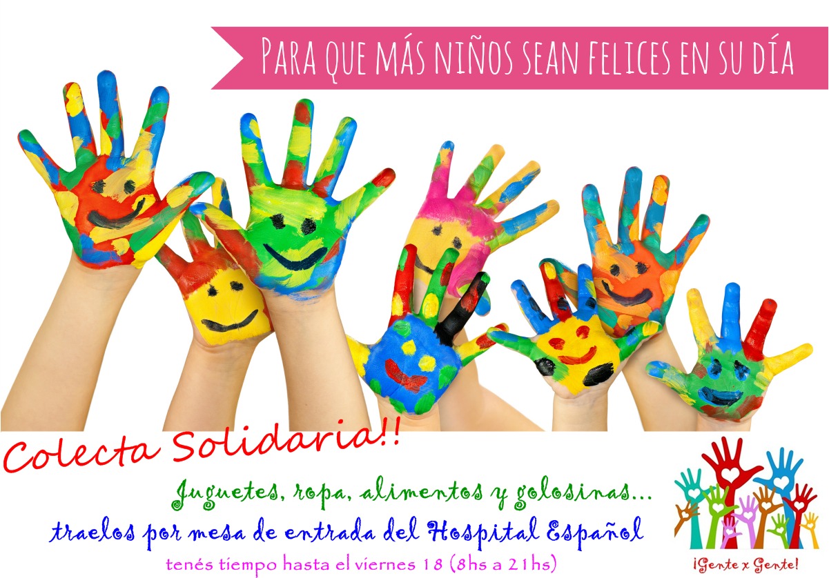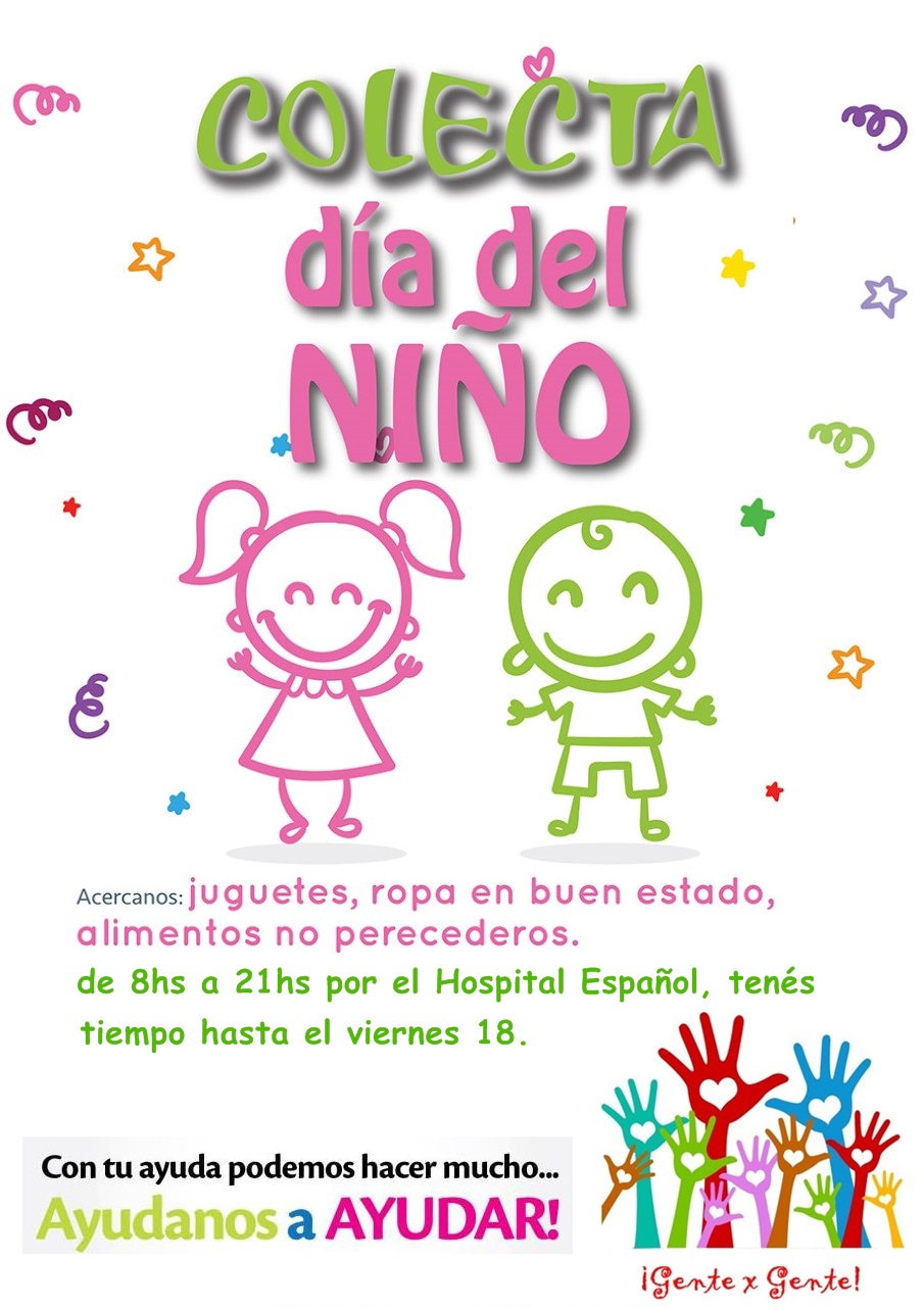 El grupo Gente x Gente pide la colaboración de la comunidad sanjuanina para celebrar el Día del Niño. Todos los que puedan aportar su granito de arena pueden hacerlo de 8 a 21, hasta el viernes 18 de agosto, por mesa de entrada del Hospital Español.