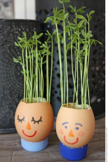 Podemos poner un trozo de algodón dentro de las cáscaras de huevo, colocar encima semillas y mantener el algodón húmedo hasta que las plantan crezcan.