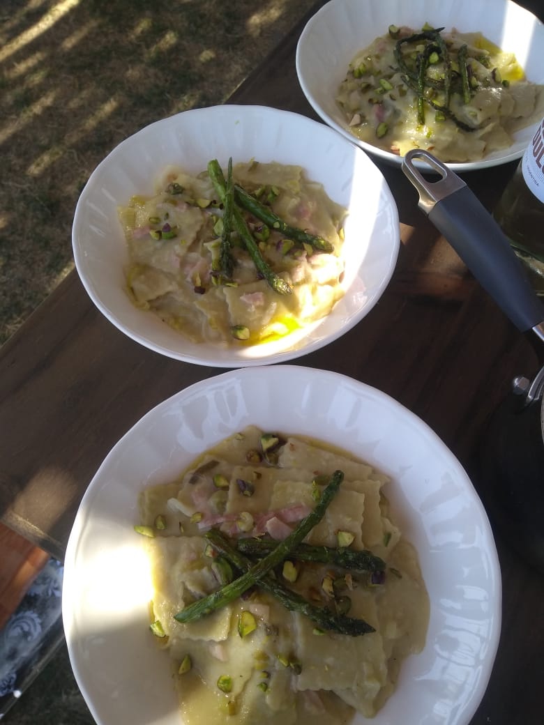 Reversión de los Mentirosos de Espinaca de la nonna Magdalena (Mentirosos de Espárragos en salsa de membrillo, panceta, espárragos fritos y pistachos)
