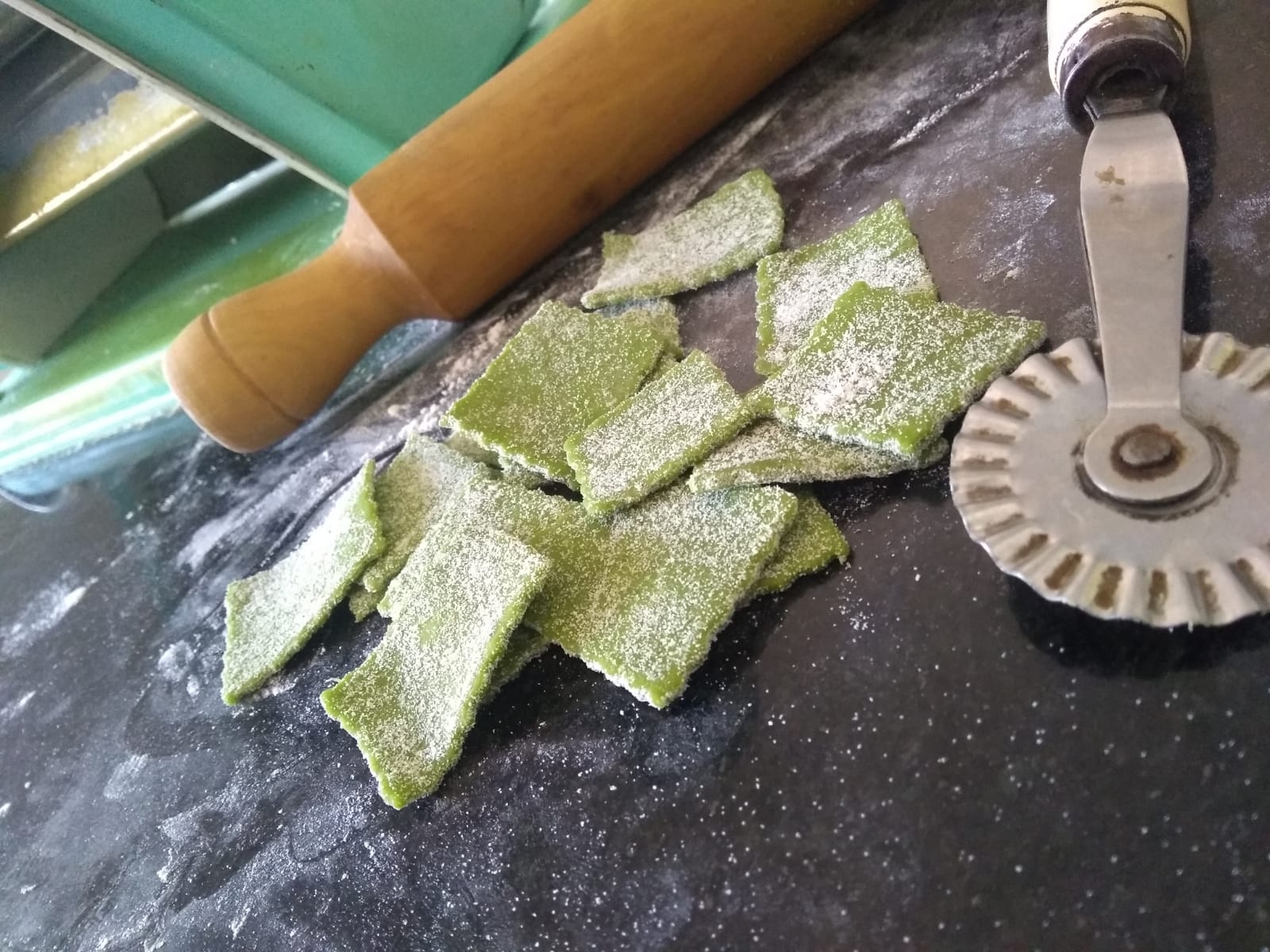 Pasar por la máquina para hacer pasta o amasar con bolillo hasta obtener un espesor de 1 mm. Dejar secar la masa unos minutos. Luego cortar imitando la forma de un raviol, con ayuda de un cortante.