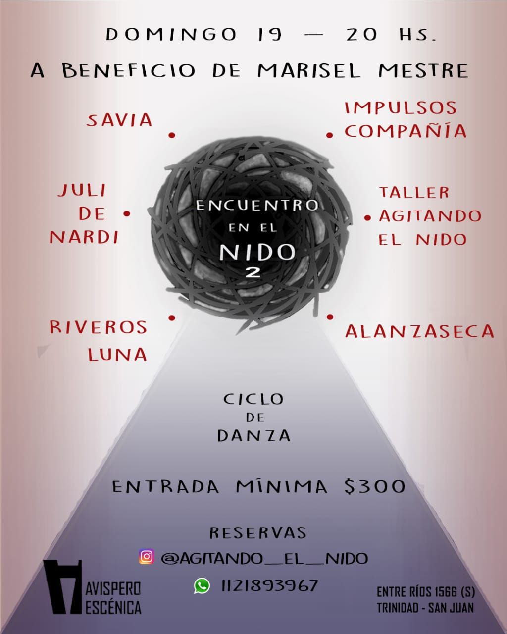 El Encuentro en el Nido será el próximo domingo 19 de septiembre, a las 20 horas en El Avispero Escénica (Entre Ríos 1566 sur). La entrada tiene un valor mínimo sugerido de $300 y las reservas se realizan al 1121893967 o en la cuenta de Instagram @agitando_el_nido.
