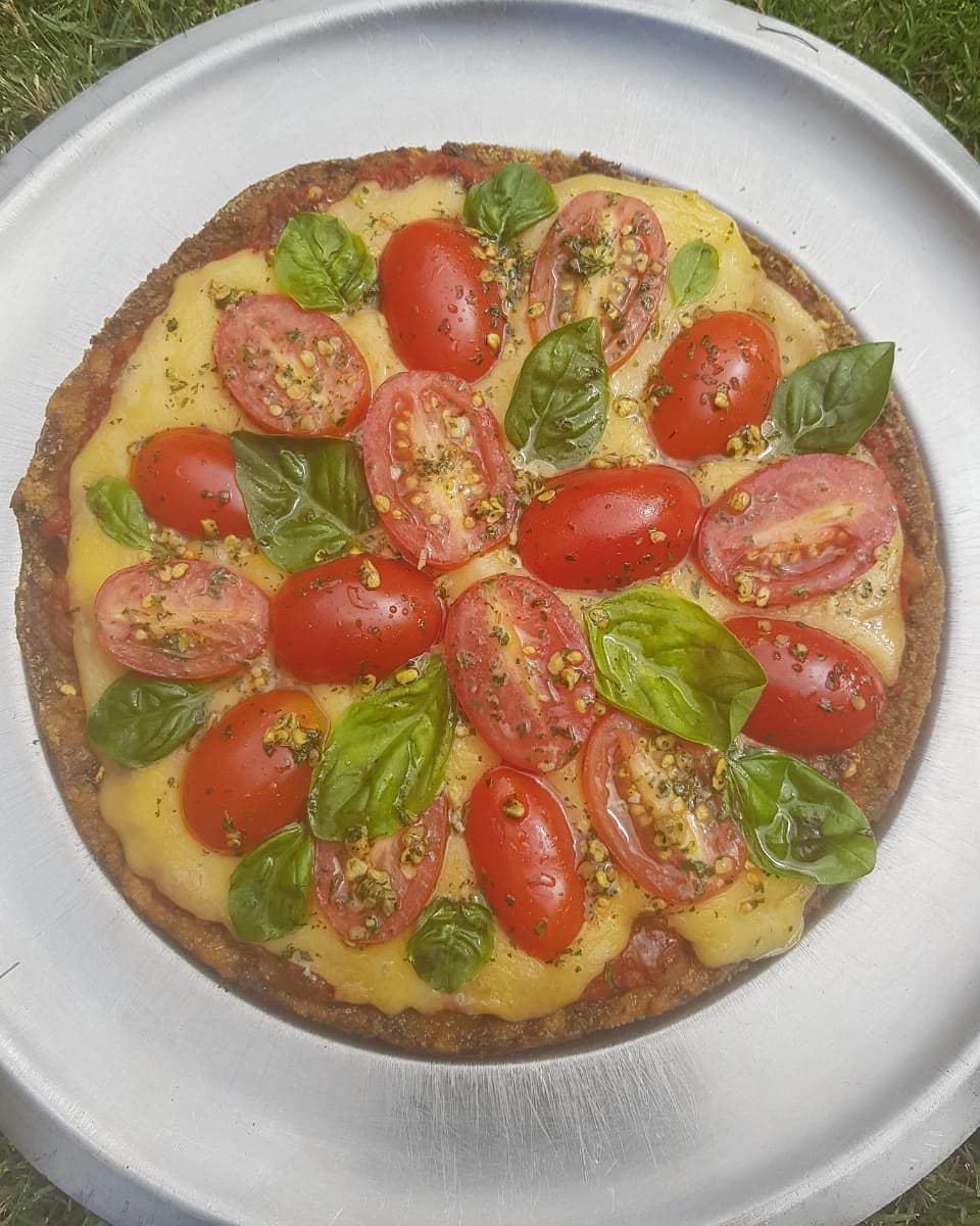 Retirar del horno, colocar la salsa de tomate, el queso y llevar al horno nuevamente. Cuando el queso esté derretido, saborizar con provenzal y colocar el tomate cherry y albahaca.