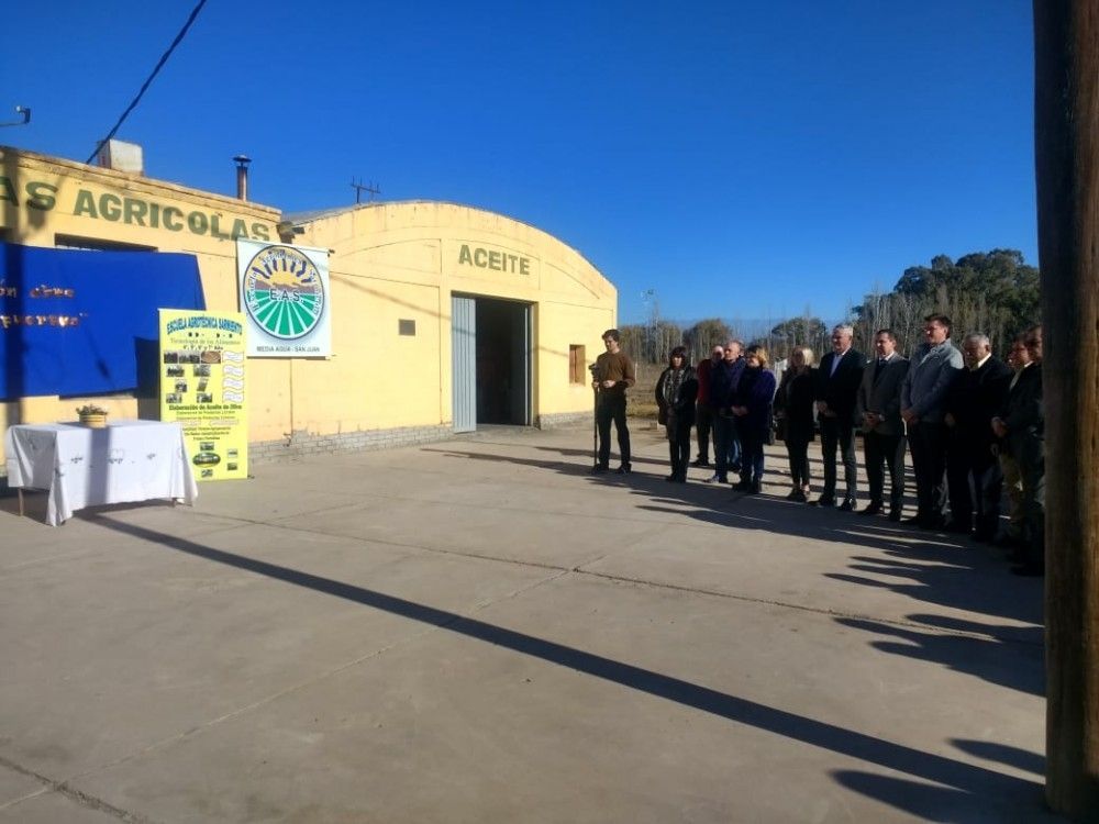 El ministro de Minería Alberto Hensel visitó Media Agua para entregar la resolución que adjudica $5 millones del Fondo Minero para el Desarrollo de Comunidades a la Agrotécnica de Sarmiento para adquirir nueva tecnología. Allí se instalará una línea de elaboración de tomate triturado en botella de un kilo y de medio, una máquina de extracción centrífuga de aceite de oliva con producción de 100 a 150 kg/h, alimentación 380 V 50 Hz.