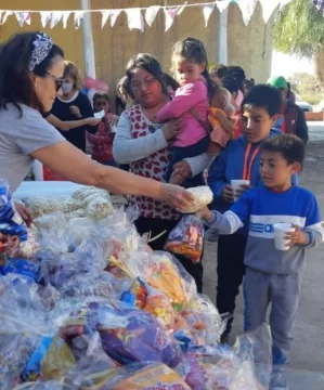 Es pleno desierto sanjuanino. Sin embargo allí viven unos 300 pobladores distribuidos en distintos puntos de Mogna, su lugar de pertenencia pese a las carencias y necesidades. Un puñado de ellos ni siquiera habita en el centro del distrito donde está la plaza, la capilla de Santa Bárbara -patrona del lugar-, y el puesto sanitario que es donde más ayuda solidaria llega, si no que transitan sus días en los puestos distantes ubicados, al menos, a 5 kilómetros de allí. Uno podría decir que están lejos de la mano de Dios, algo que ellos no consideran porque cuentan con la capilla de San Nicolás donde celebran varias fiestas religiosas y mantienen intactas muchas tradiciones. Hasta ese lugar llegaron el sábado 1 de agosto un grupo de familiares y amigos para llevar ayuda y alegría a 75 niños que viven en la zona: bandejas con golosinas, juguetes nuevos, zapatos, ropa y medias para celebrar por anticipado el Día del Niño. A la par dejaron medicamentos donados por Laboratorios Bagó en el Puesto Sanitario del centro poblacional.