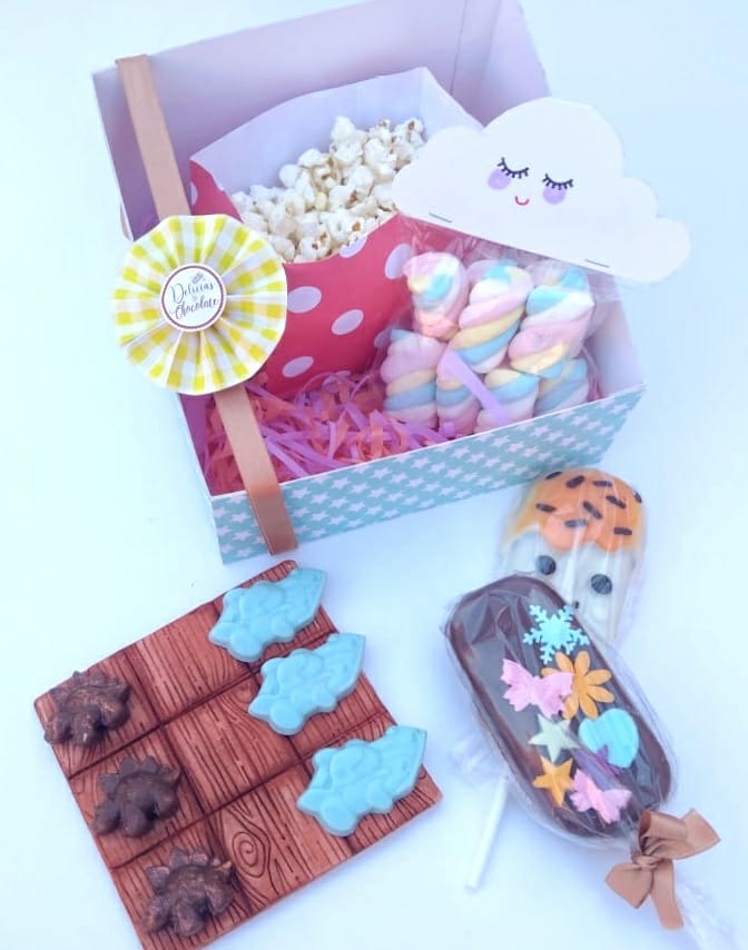 ¿Habrá algún niño que no le guste el chocolate? En principio no, al menos hay una gran mayoría que se deleita con este alimento delicioso. En base a esto, Yamila Correa de Delicias en chocolate diseñó una caja de regalo con: cakes paletas (son como los helado de palito pero rellenos), un juego de Tatetí hecho de galletas (de chocolate, obvio), y masa comestible con diferentes motivos a elección (dinosaurios o sirenas). Todo esto acompañado por malvaviscos y pochoclos.