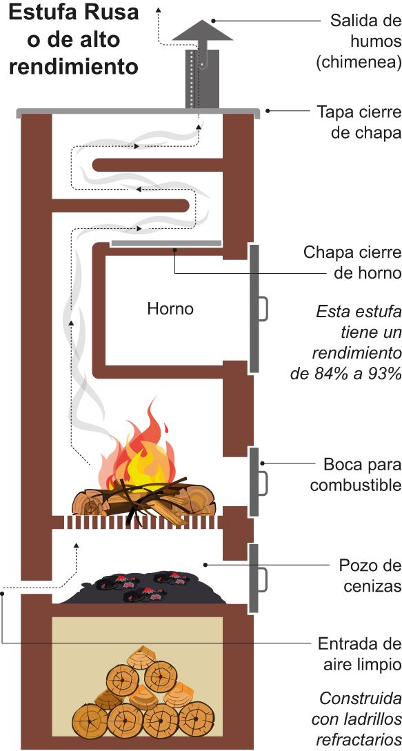 Sensación que puede caer abruptamente si se analiza la eficiencia y los costos que demanda el uso de madera en los llamados hogares, tan decorativos y pintorescos. Pero ¡a no asustarse!, porque existen diversas opciones de artefactos que ofrecen las mismas sensaciones pero con alta eficiencia en el uso de la materia prima. Se trata de las estufas rocket y también de las rusas que ya están siendo construidas con éxito en San Juan. Todo comenzó hace un par de años en Mogna donde se instalaron con el asesoramiento de los técnicos del Instituto Nacional de Tecnología Agropecuaria (INTA). Una idea digna de copiar por aquellos que quieren usar este tipo de calefacción más eficiente, económica y sin gases contaminantes. Ni hablar si se le suma al mismo artefacto otro nivel para cocinar alimentos, una alternativa que las convierte en una verdadera opción para zonas donde la leña es un material de uso cotidiano o para quien quiera hacerlo en su hogar.