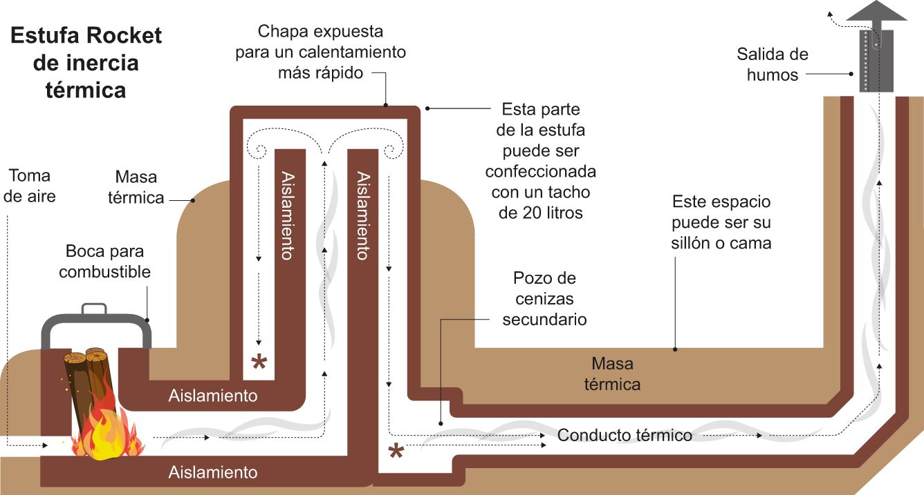Tanto las rusas como las rocket son estufas de inercia térmica, es decir que son grandes masas de mampostería que acumulan energía y luego la entregan al ambiente. "Es como una batería, es decir que uno hace fuego, tanto en la rusa como en la rocket, y una vez que se apaga ese calor queda acumulado y sigue en el ambiente. Es muy interesante porque, por ejemplo en la noche, uno se va a dormir no queda el fuego prendido y la casa sigue calentita. En el caso de la rocket entrega calor en las tres formas que existen, por radiación, por convección y por conducción. Es la única que lo puede hacer. Si bien la rusa es similar no tiene el banco de masa donde uno puede sentarse o acostarse. Es más completa", indica el ingeniero Sosa.