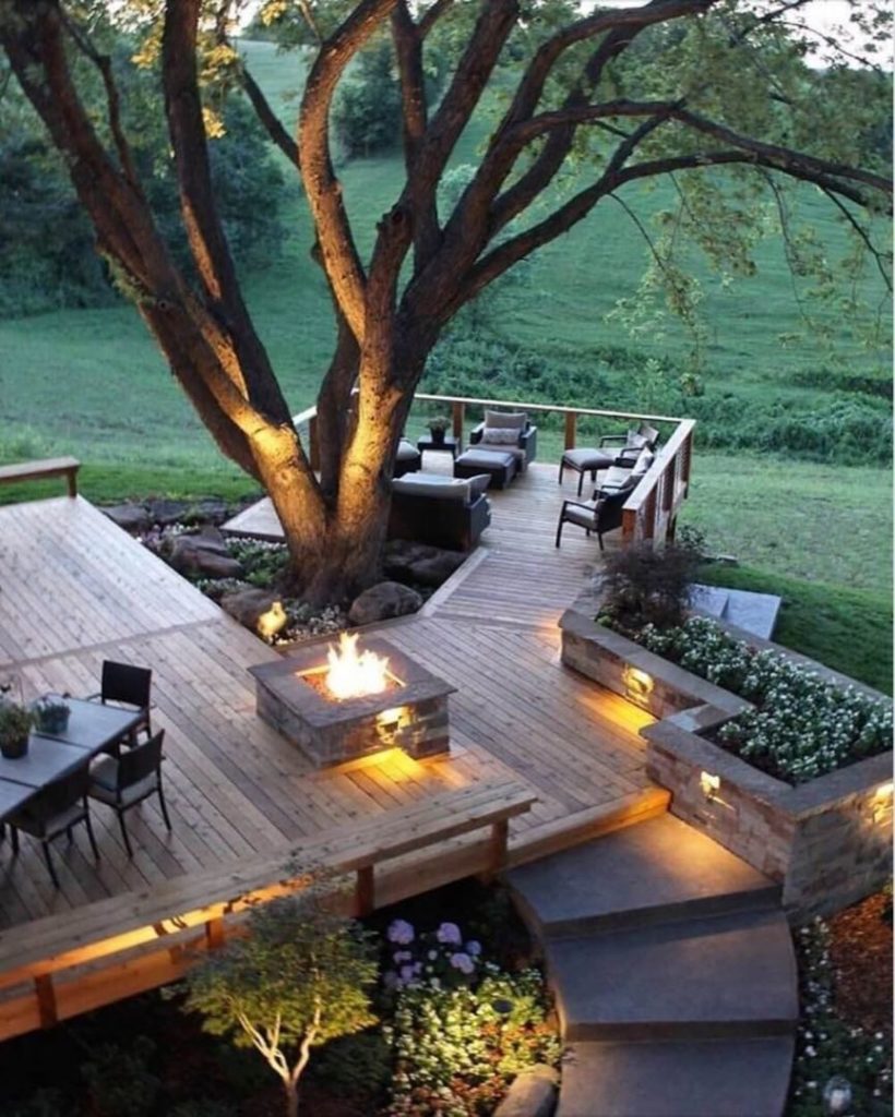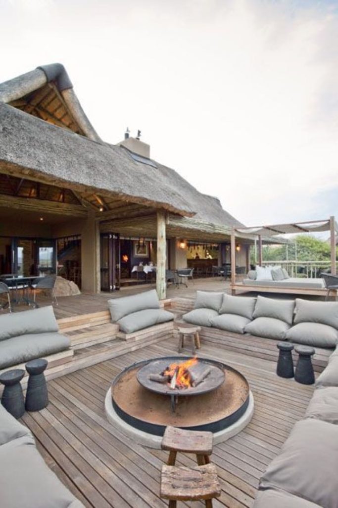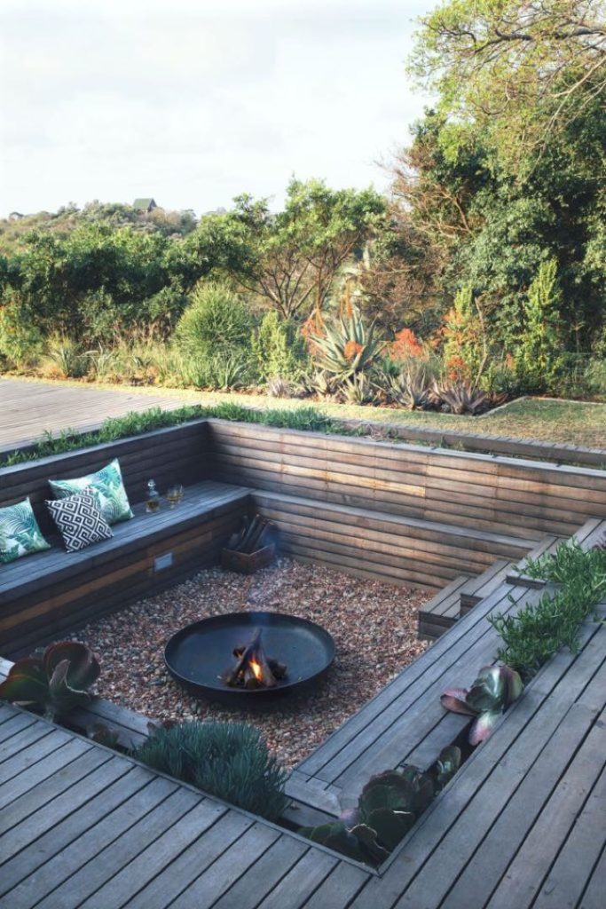 Un gran plato de hierro circular compone este fogonero de diseño simple, pero que ocupa el centro de un espacio pensado especialmente para su uso: montado sobre una base de piedras partidas, aparece escondido (muy protegido) por una estructura cerrada con gradas de deck de madera que le dan forma a los sillones y la escalera.