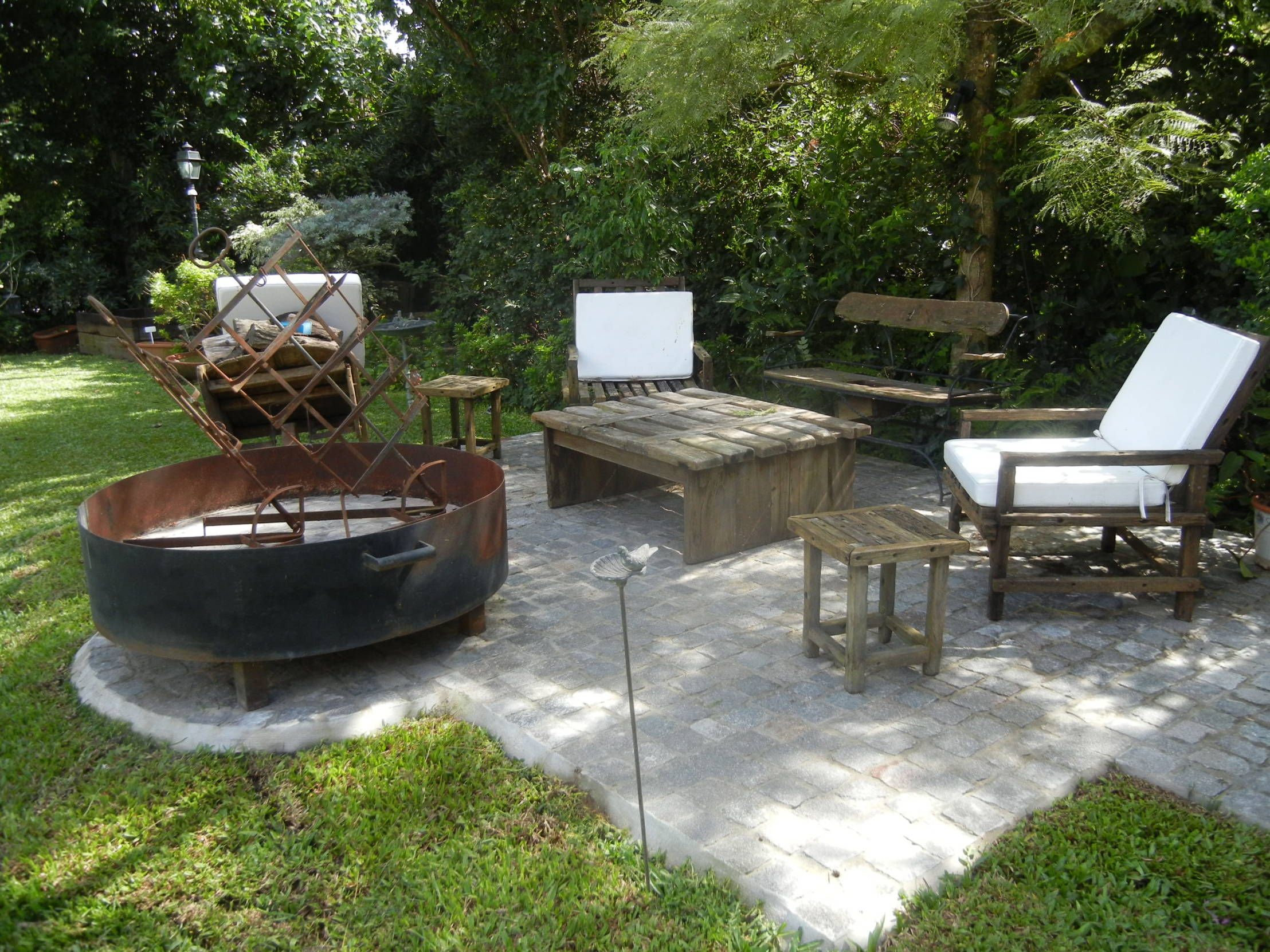 Un plato de hierro óxido montado sobre otro de mayor diámetro y con una base de cemento, le dan forma a este sencillo fogonero, que sin embargo, es el rey absoluto del deck con sillones que lo rodean.