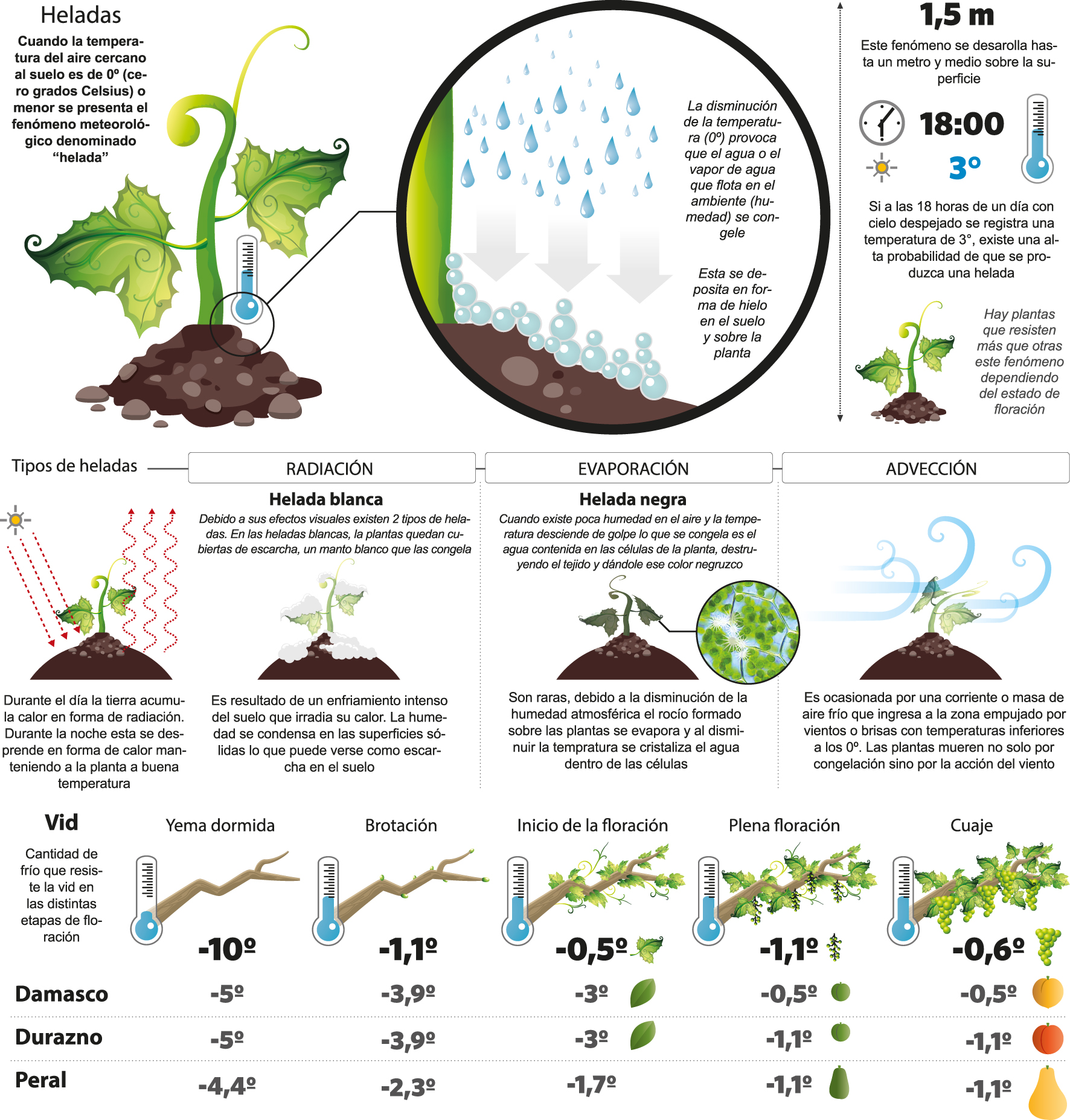 Los tipos de heladas, radiación, evaporación y advección, y su explicación, pueden verse en la info de la página siguiente del Suplemento Verde, número 5, donde además se indica la sensibilidad especial de varios cultivos, como el caso de la vid, y de frutales de carozo y de pepita, en diferentes fases fenológicas de su ciclo de vida.