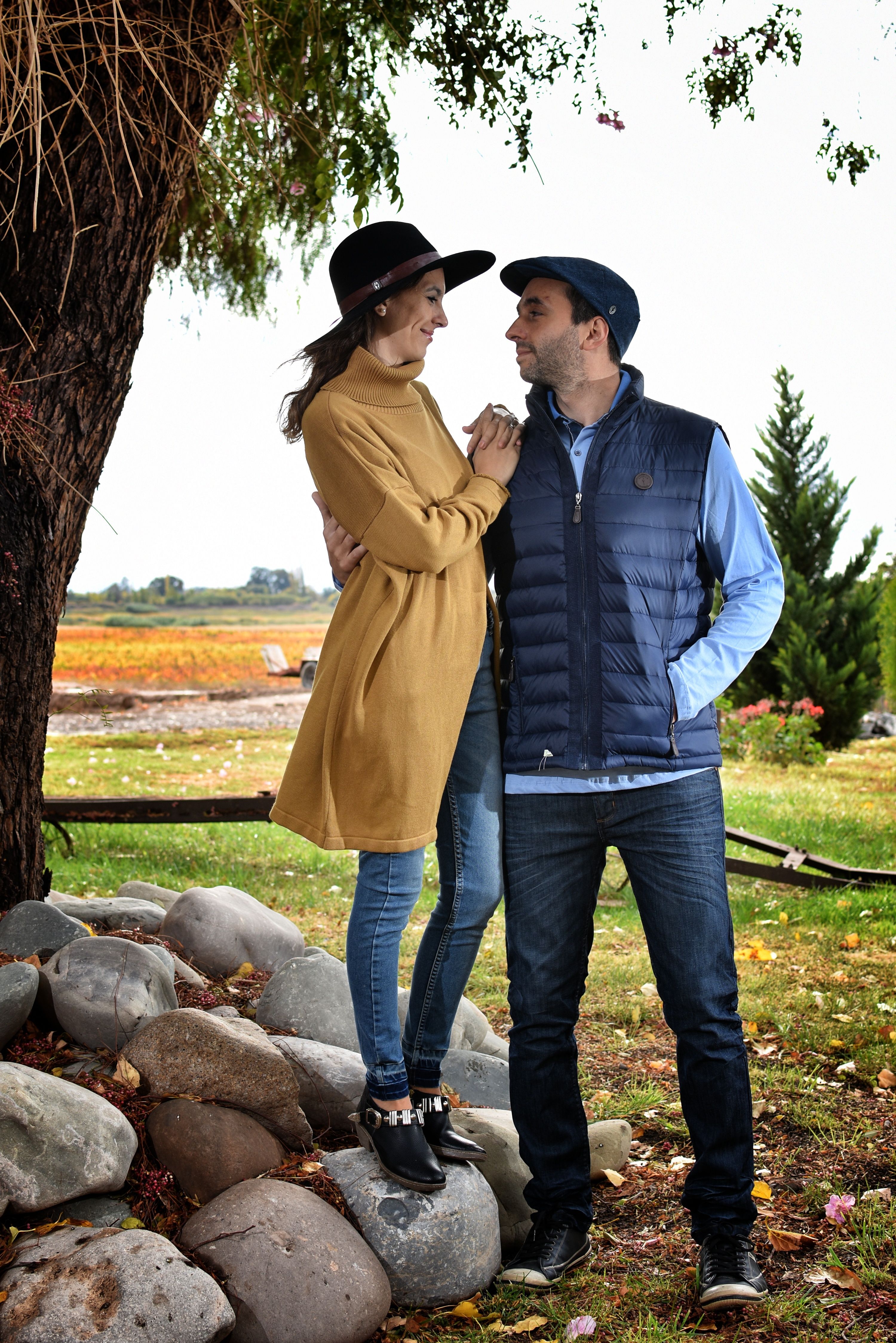 Cómplices. Ella con jean con detalle de trenza en el pasacinto y ruedo con desgastes ($3.725), polera de lana de color maíz ($4.500) y sombrero negro con cinta de cuero marrón ($2.420). Él, con jean añejo ($3.975), remera polo en algodón ($1.850) y chaleco con relleno de plumas de ganso ($8.880). El detalle masculino: gorra de lana con detalle de gamuza ($1.695).