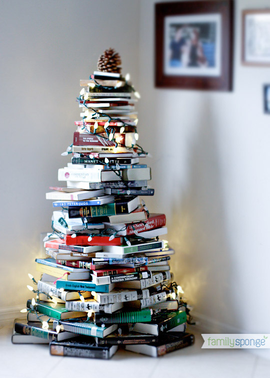 Si te gusta leer y tienes libros por casa, puedes construir un hermoso árbol que sólo te llevará un poco de tiempo darle la forma, luego los toques finales podrán ser luces, cintas, moños, etc.