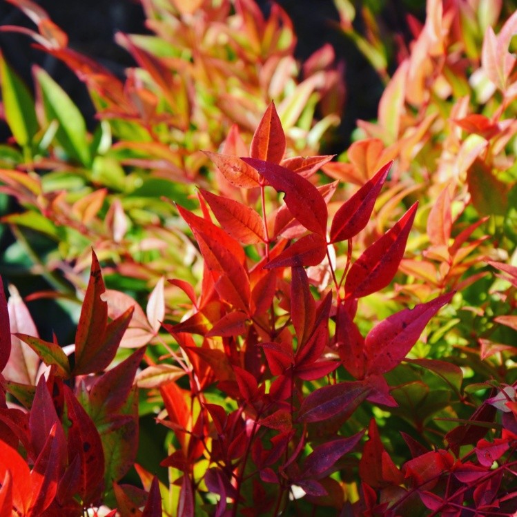 Nandina domestica: Es perenne. Durante el otoño e invierno, si se encuentra ubicado a pleno sol y expuesto a bajas temperaturas, sus hojas viran a colores cobrizos y rojizos. Photinia serratifolia sin. serrulata: Es perenne, con atractivos colores otoñales. Las hojas más viejas viran hacia colores rojos, siendo esta una de sus principales características. Rhus succedanea: Es caduco. Al comenzar el otoño, las hojas viran hacia la gama de los naranjas-rojizos. Rhus typhina: Es caduco. Sus hojas viran desde colores amarillentos hacia anaranjados y rojizos en el otoño Spiraea japonica: Es caduco, con interesante colores que viran hacia los dorados y rojizos en el otoño, antes de caer las hojas.