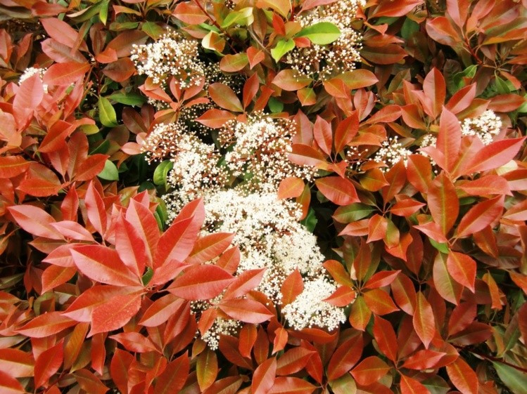 Photinia serratifolia sin. serrulata: Es perenne, con atractivos colores otoñales. Las hojas más viejas viran hacia colores rojos, siendo esta una de sus principales características. Rhus succedanea: Es caduco. Al comenzar el otoño, las hojas viran hacia la gama de los naranjas-rojizos. Rhus typhina: Es caduco. Sus hojas viran desde colores amarillentos hacia anaranjados y rojizos en el otoño Spiraea japonica: Es caduco, con interesante colores que viran hacia los dorados y rojizos en el otoño, antes de caer las hojas.