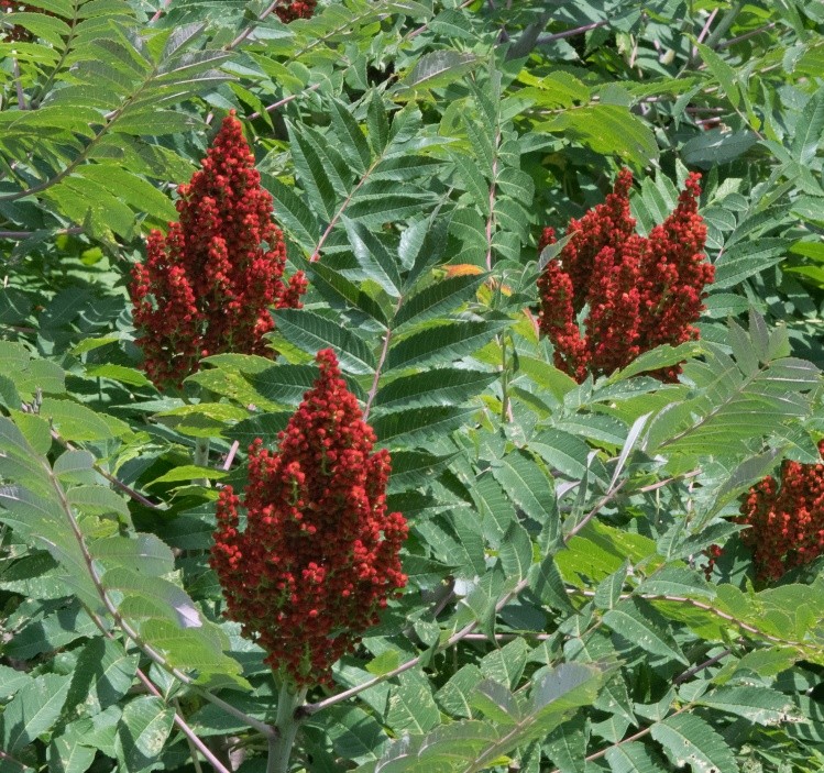 Rhus typhina: Es caduco. Sus hojas viran desde colores amarillentos hacia anaranjados y rojizos en el otoño Spiraea japonica: Es caduco, con interesante colores que viran hacia los dorados y rojizos en el otoño, antes de caer las hojas.